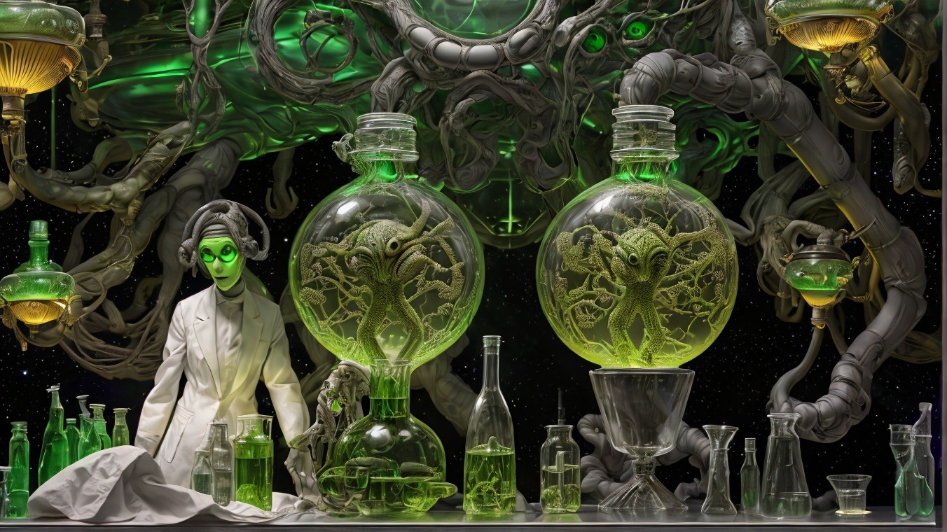 An alien scientist in a lab with large flasks containing colorful substances, set against a space backdrop with planets and stars.