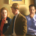 A close-up shot of three people standing together inside an art gallery, with two framed paintings in the background against a light yellow wall. From left to right, a young woman with long blonde hair, wearing a red shirt and a black peacoat, looks towards a man on the right.