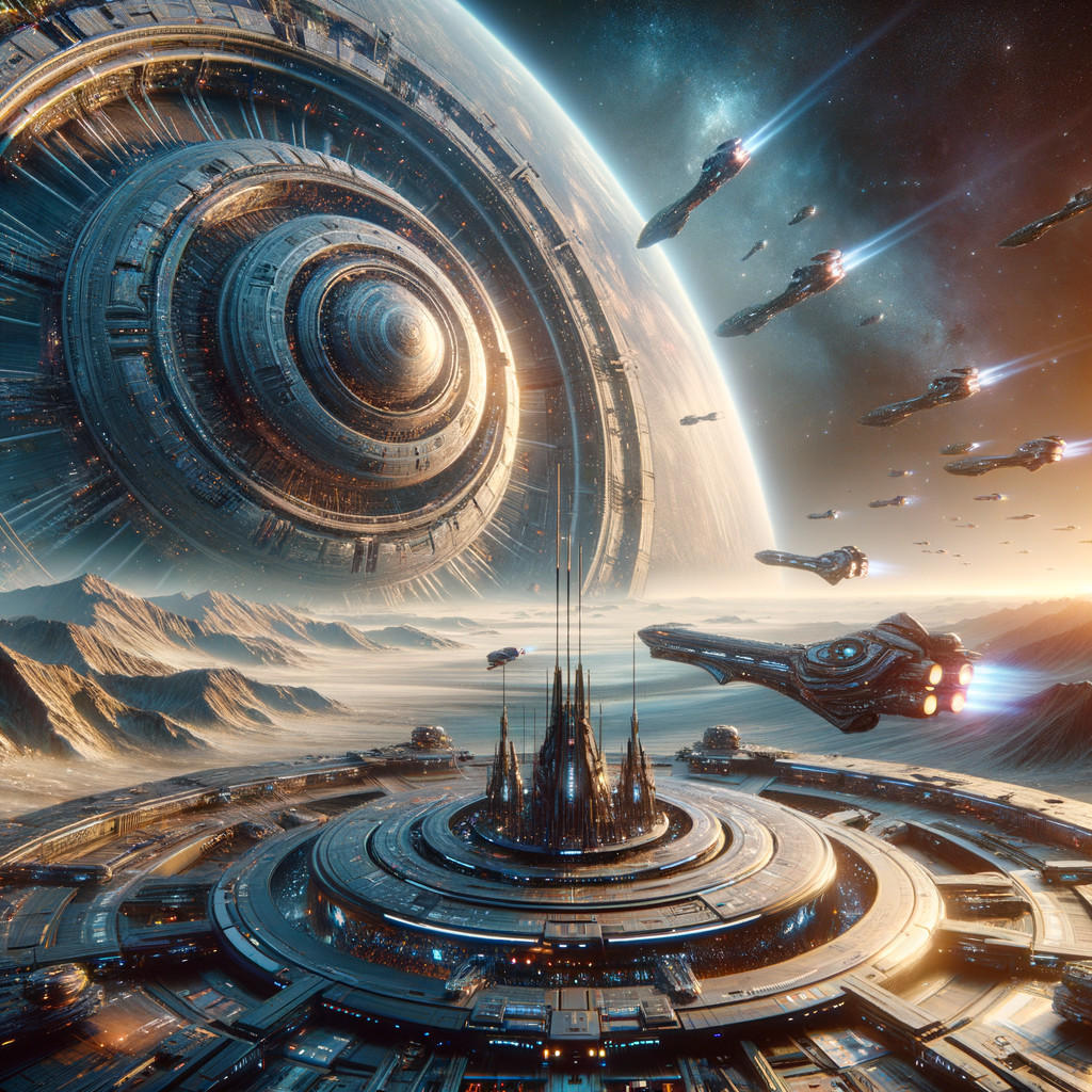 Futuristic spacecraft in dynamic space battle with explosions and celestial body