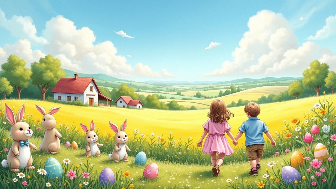 A cheerful scene of rabbits in a vibrant meadow, surrounded by colorful Easter eggs.
