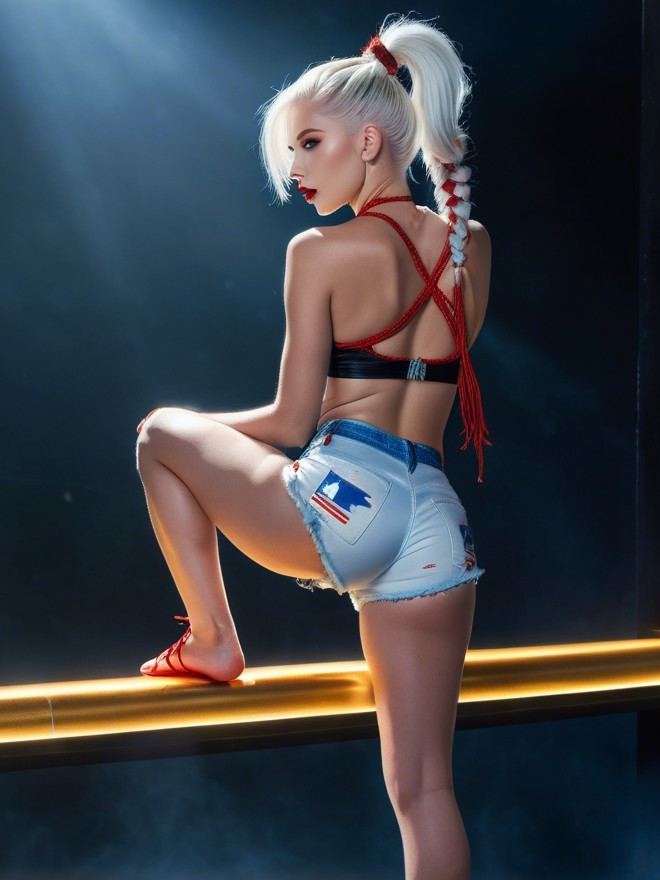 A stylish figure poses on a bar railing, wearing a vibrant red top and polka-dot shorts. Her hair is a playful combination of colors, and she sports bold red heels, set against a moody blue backdrop.