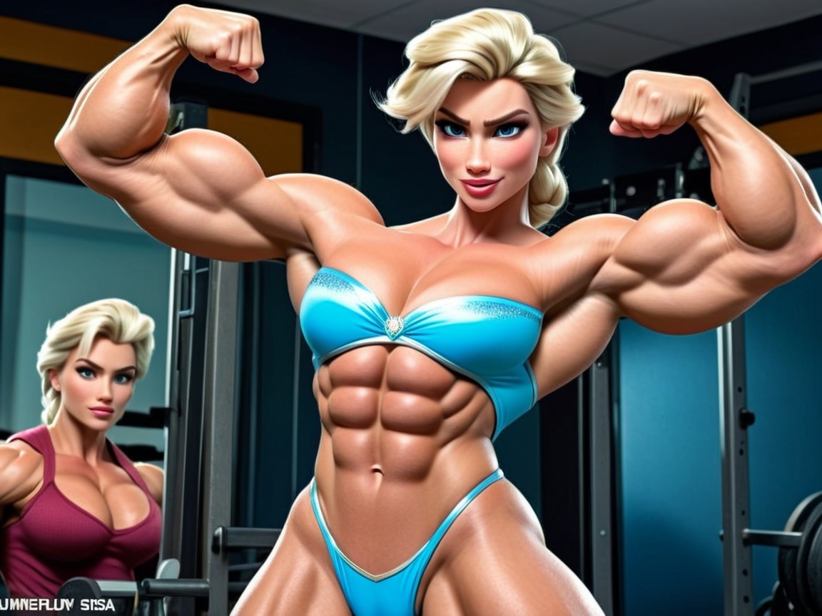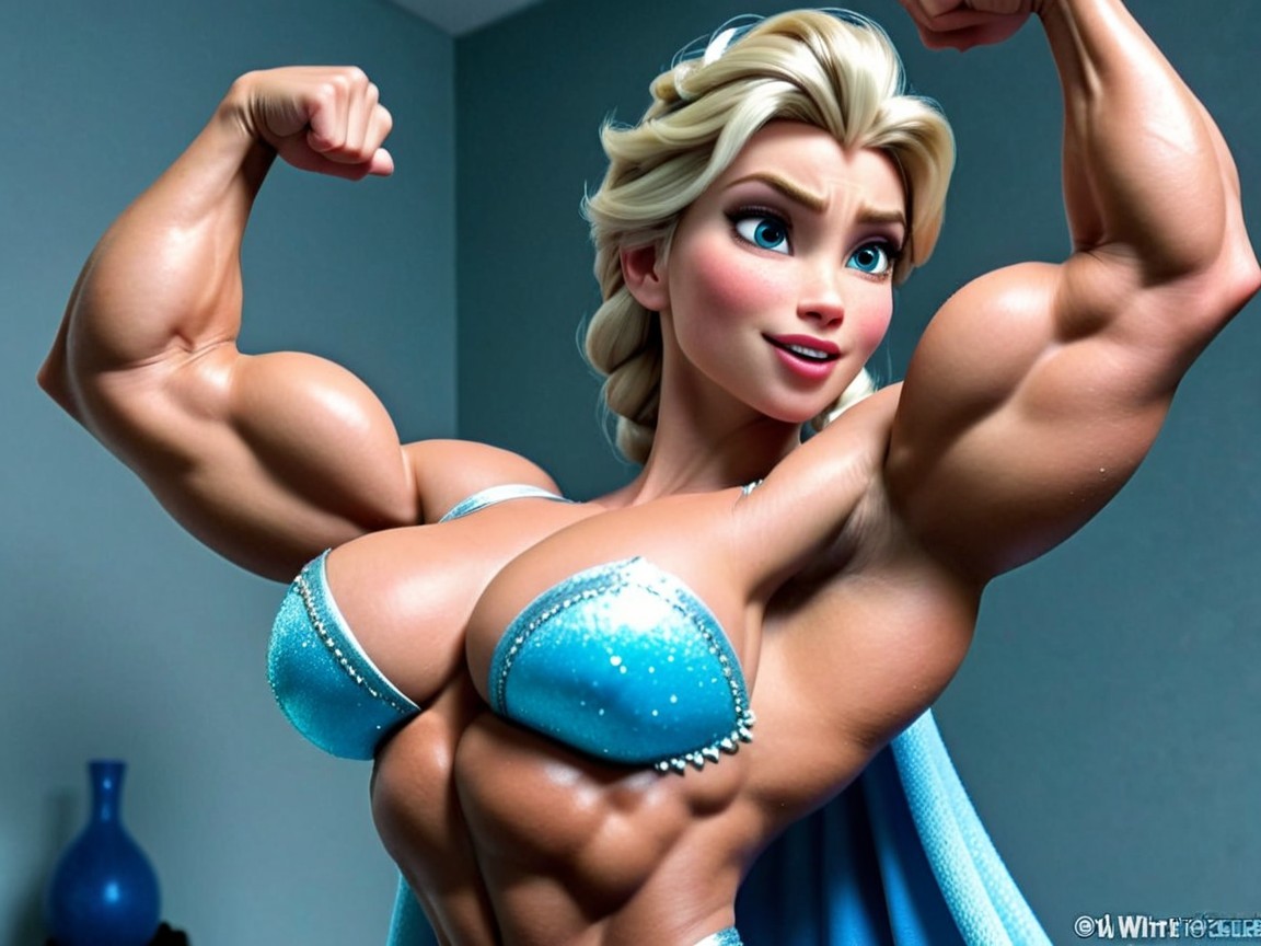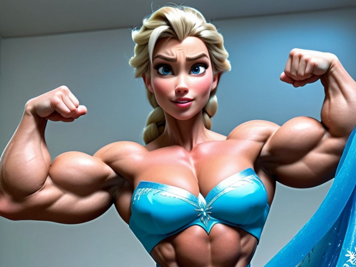 The image features a muscular animated character resembling a strong version of a classic princess. She has long, blonde hair and wears a sparkling blue outfit, flexing her impressive biceps.