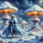 A majestic figure in shining armor stands in a snowy forest, surrounded by giant illuminated mushrooms. The ethereal atmosphere is enhanced by a starry sky above, creating a mystical scene.