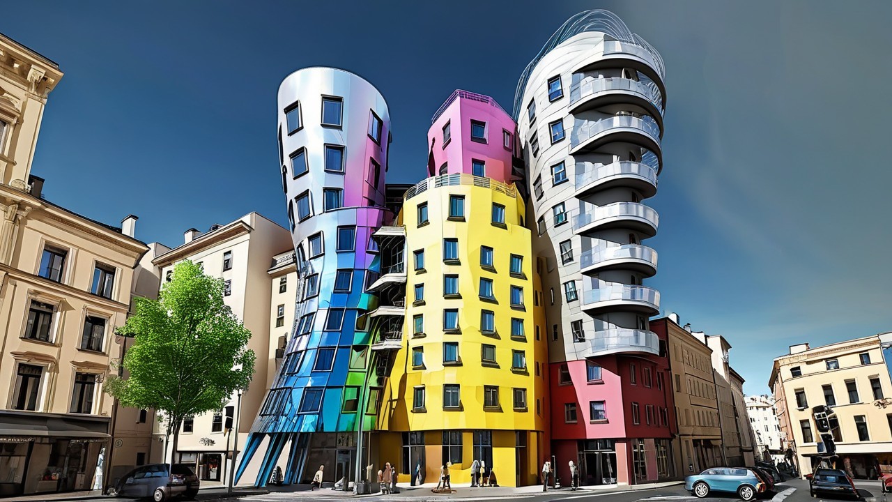 The image features a striking modern building with an eclectic design, showcasing twisting colorful facades in blue, yellow, pink, and metallic finishes, set against a clear blue sky...