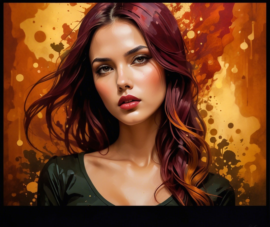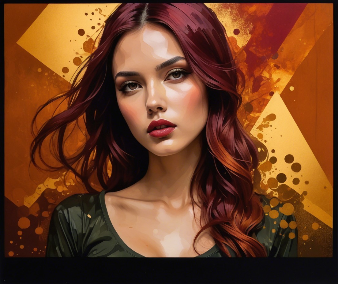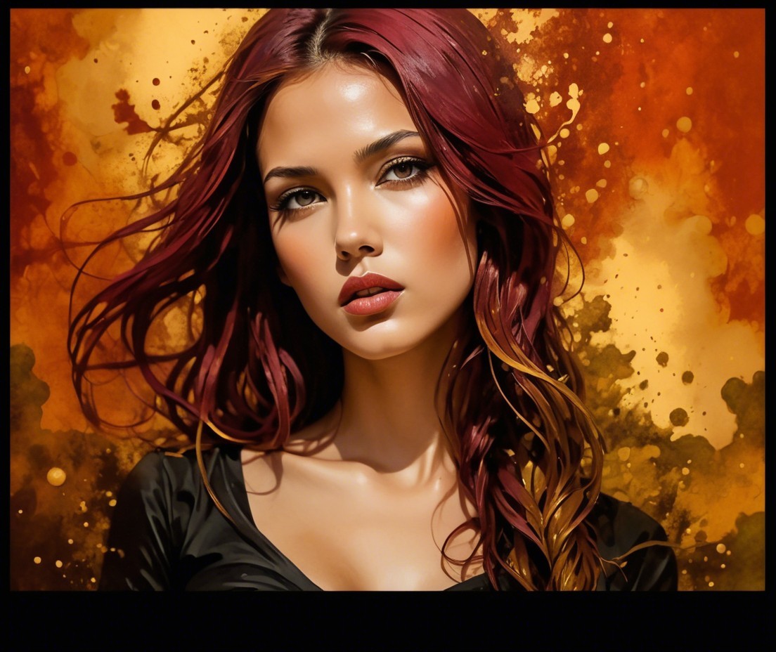 A portrait of a young woman with flowing maroon hair and a captivating gaze, set against a vibrant, abstract background featuring warm hues of orange and yellow.