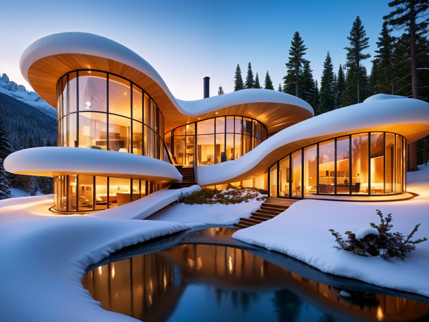 A stunning modern architecture marvel, this home features smooth, curved lines, large glass windows, and wooden accents, surrounded by snow-covered trees and a serene reflective lake.