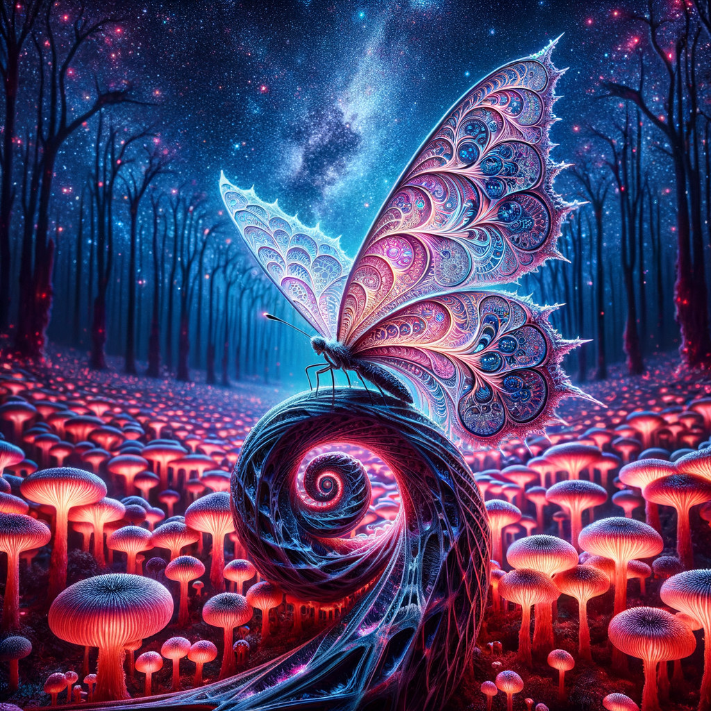 Prompt: "An prehistoric butterfly sitting on a crystalline branch inside of a bioluminescent crimson fungal forest with hypnotic psychedelic patterns covering its impressive wings. Intricate ornate detailed patterns, Hyper-detailed. Starry night.Soporific atmosphere.