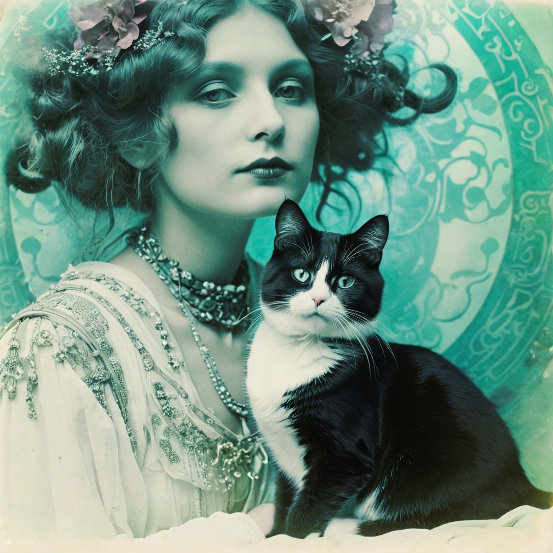 (Try it from By Deception and inspired by Aaron Gerschler) - A vintage portrait featuring a woman with elaborate curls adorned with flowers, elegantly dressed, sitting beside a black-and-white cat, set against a soft, decorative background.