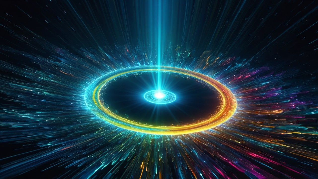 A vibrant cosmic scene depicts a glowing central point surrounded by a radiant circular halo, with beams of light radiating outward, creating a stunning visual of energy and motion in space.