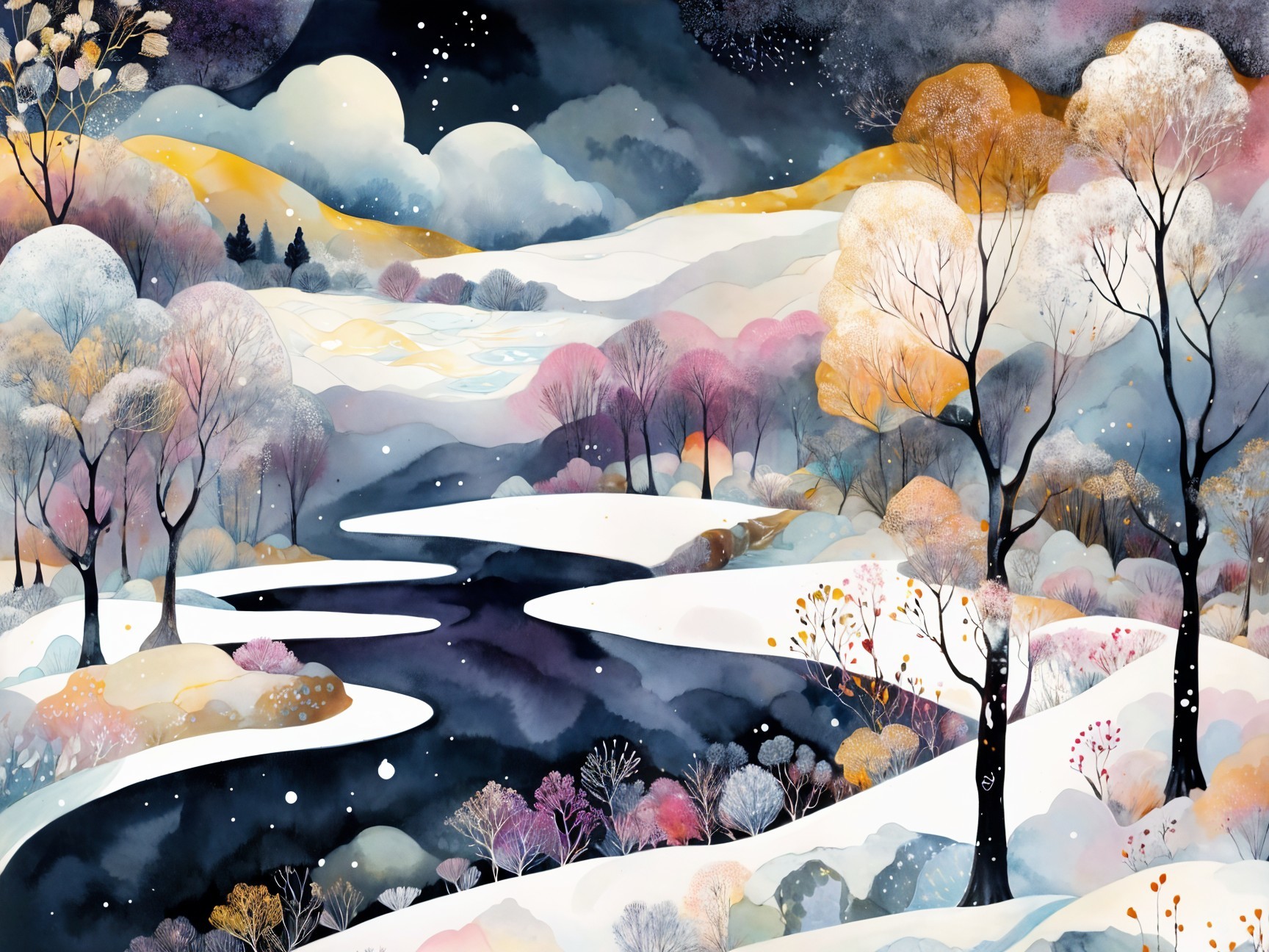 A serene winter landscape features gently rolling hills, a calm river reflecting the pastel hues of a twilight sky, and trees adorned with delicate snow and blossoms, evoking tranquility.