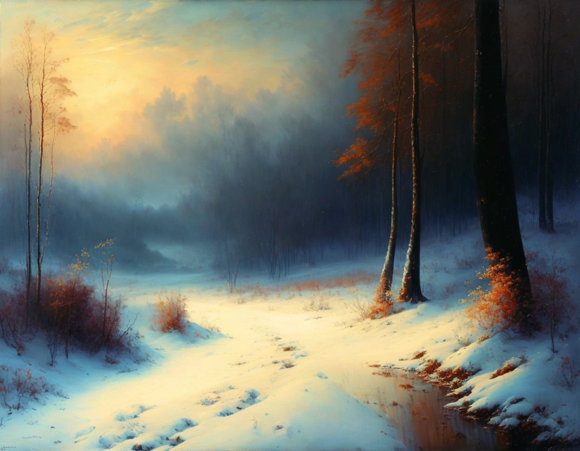 Prompt: a mist colorful twlight with snowy covered land with a dirt road lined with old trees. Glowing with vibrant hues, sky transitioning from warm orange to deep purple.