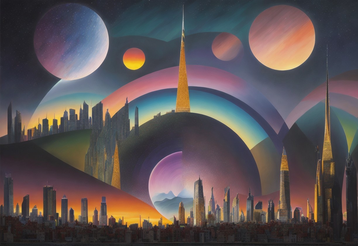 + Prompt:" fantastic city, cubism art +pointillism art + mosaic art +sunrise, masterpiece ,ultra 4 k, cinematic +colorful +sky circles art colorful + yacek yerka +karol Bak ++soft colorful "TERRY REDLIN+ MICHAEL Michael Parkes"