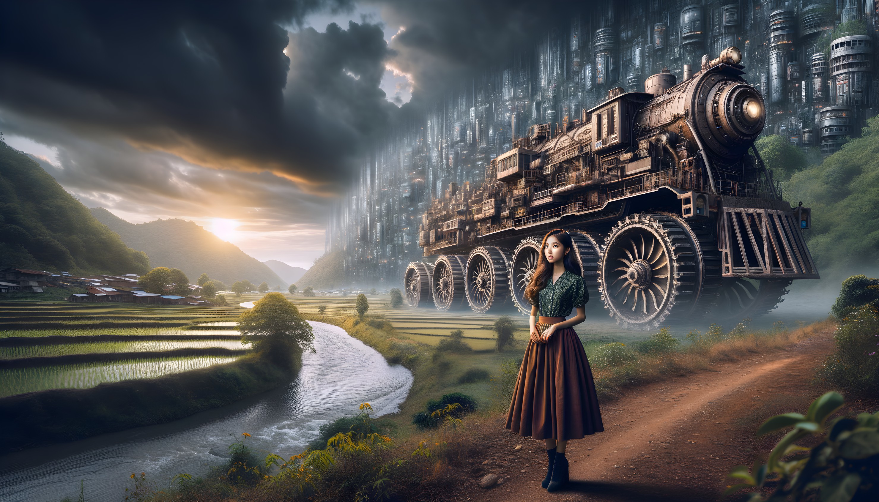 This was supposed to be a gorgeous young woman standing in front of a "Traction City" (a giant mobile city on giant tank continuous track wheels) from the movie "Mortal Engines". Her face could be more beautiful, but the overall effects are stunning