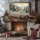 A cozy room decorated for Christmas, featuring a beautifully lit tree, a warm fireplace with a glowing fire, colorful presents, and festive artwork, all under a starry night sky.