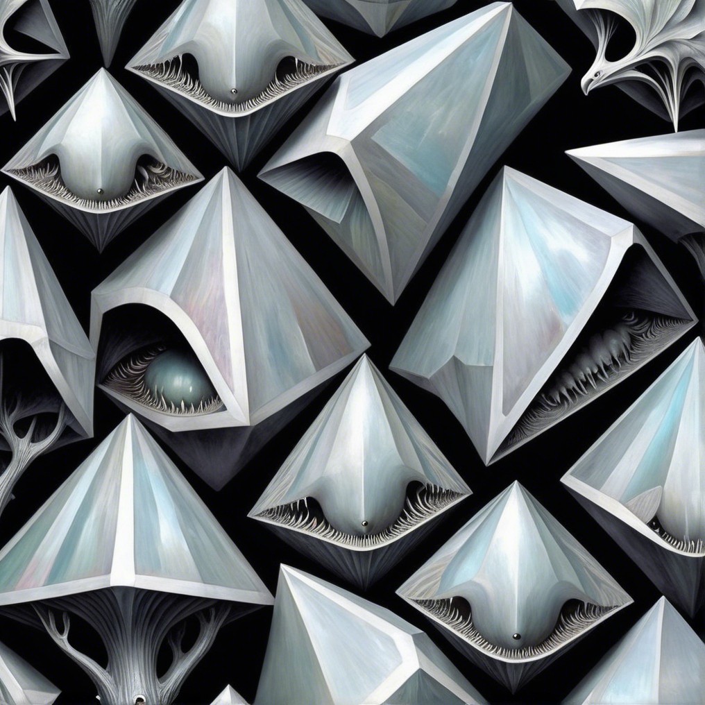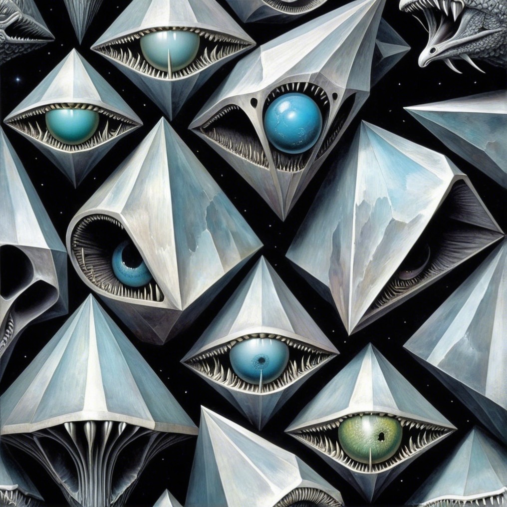 The image features a surreal composition of geometric shapes resembling pyramids, each with a vivid, expressive eye, set against a dark background, creating an intriguing and mysterious effect.