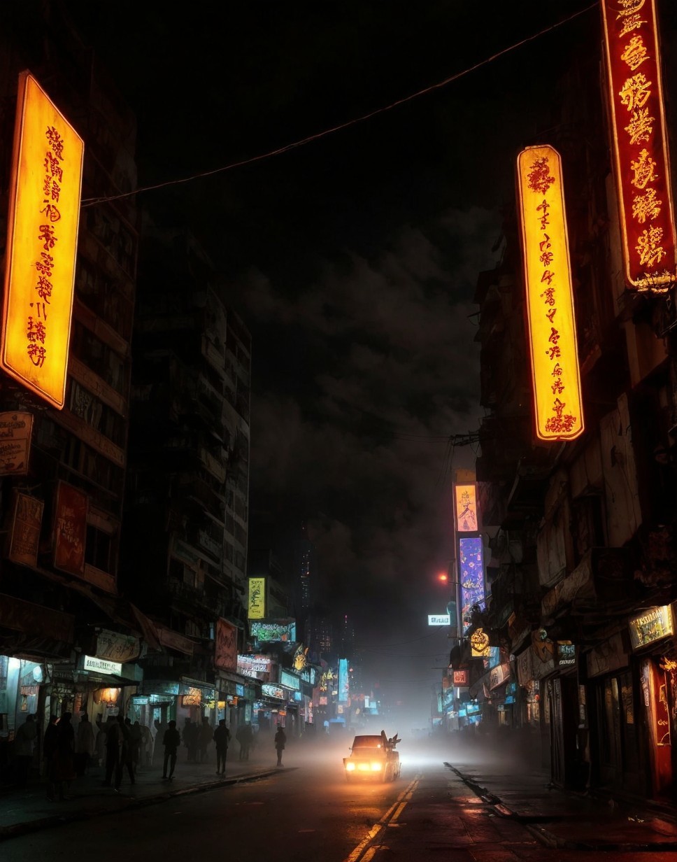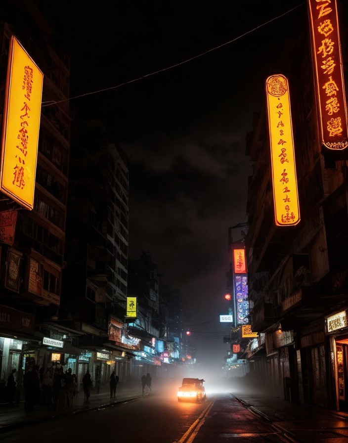 A dimly lit urban street at night, lined with glowing neon signs in various languages. A lone car drives down the empty road, shrouded in mist, creating a moody, atmospheric scene.