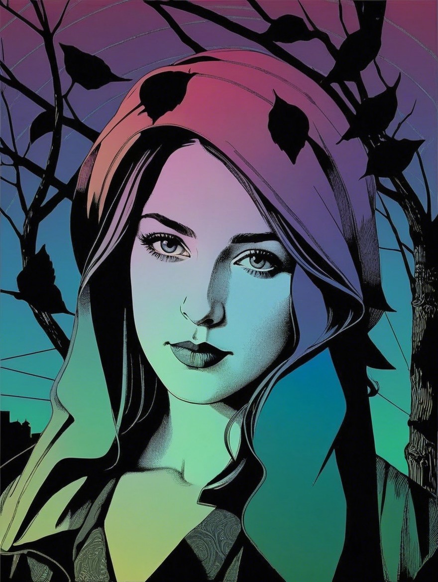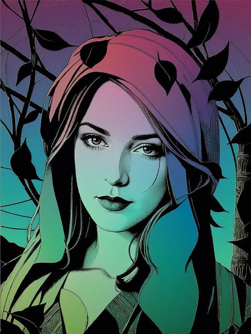 Prompt: Stylized Portraiture, woodblock print in style of Théophile Alexandre Steinlen, kinetic line-art,gradient colors, plotting technique, tesselated, stippled, marinism,layered geometrical vector art, 3 layers of dof ,simplified, simplistic, romantic abstraction, great depth and scale, warm tones, darkened sky, crisp quality, realismo mágico, blue tones, precisionr, aytraced shadows, gothical, american gothic 1.7, layered geometrical vector art, squiggly lines, ghostly, shadowy, lineage mosaic, raytraced shadows 1.8, concept art reminiscent of stencil style, intricate , Xeroxed, colourful, minimalistic composition by Hope Gangloff and Overton Loyd and Brad Kunkle and John Philip Falter and Rene laloux, gradient colors, contouring lines, filigrane, paint overspray, brightness 1.4, fabric textures, divisionism, Watercolor and ink extrusion, stylized portrait of a female diva, glossy, abstract, coherent, extremely detailed, intricate textures ,frontal view, colourful ,hdr, splashed watercolor details, triadic color scheme blue yellow green, hues, raytraced shadows 1.8, divisionism, plasticity 1.6, complexion 1.4, enlightened, deep color, aquarelle, intricate ink art, stylized, hatching, colorful, deep colors, headshot,dyed, watery aquarelle details, close-up, inkpunk 1.3, hues,golden ratio, contouring outlines, beautiful composition 1.9 by Susan Seddon Boulet and Georgia O'Keeffe, highly detailed close-up image, background shows grungy textured rusted and corroded painted metal, with a variety of layers and colors. highlighting sections of Auburn, yellow, and brown hues. The surface is rough and worn, with visible irregularities and crevices. The background has a blurred effect, emphasizing the leaves details. Background shows shapes and textures lhighlighting the contrast between the dark and wavery areas. Increased of beauty and complexity. Raytraced shadows 1.8, divisionism, radiance,overall composition by Ralph Steadman and Jessica rossier