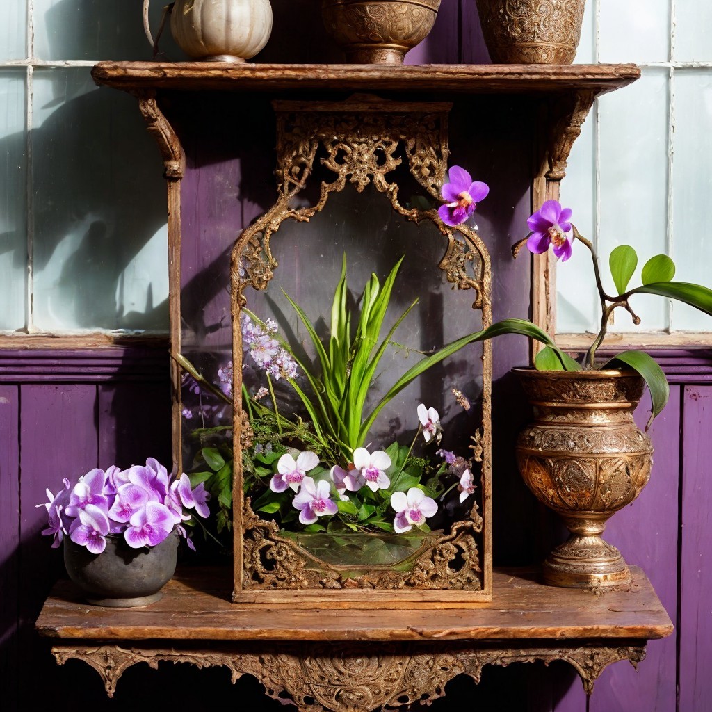 Prompt: "On an old filigree shelf in the darkest corner of a Victorian botanic greenhouse.aged glass in wooden frames, corners smeared with a hundred years of dirt. The most rare orchid on earth is blooming , pure white petals with purple stamen, in a n ornate terracotta pot, cracked but mended many times, vintage aesthetic with muted a nd hazy colour"