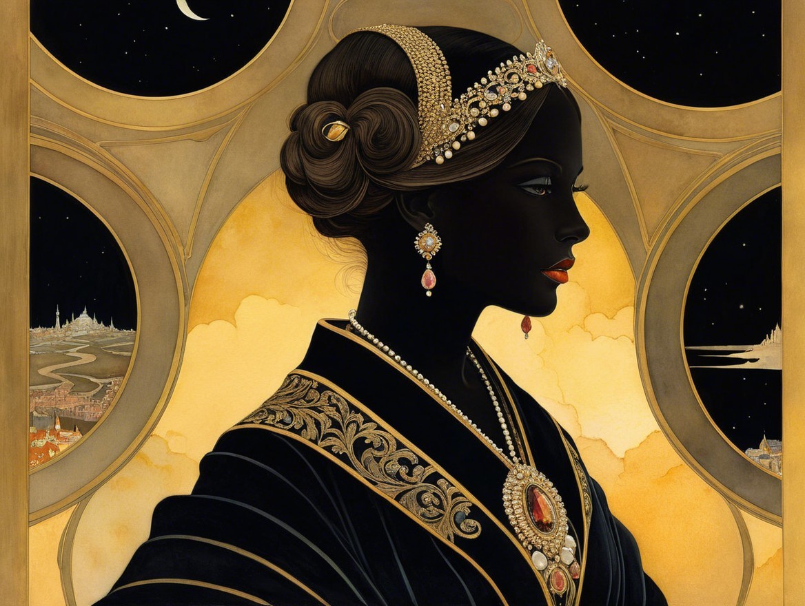 A striking profile of a woman adorned with elegant jewelry, set against a celestial backdrop of moons and stars. Her dark silhouette contrasts beautifully with the warm tones of the scene.