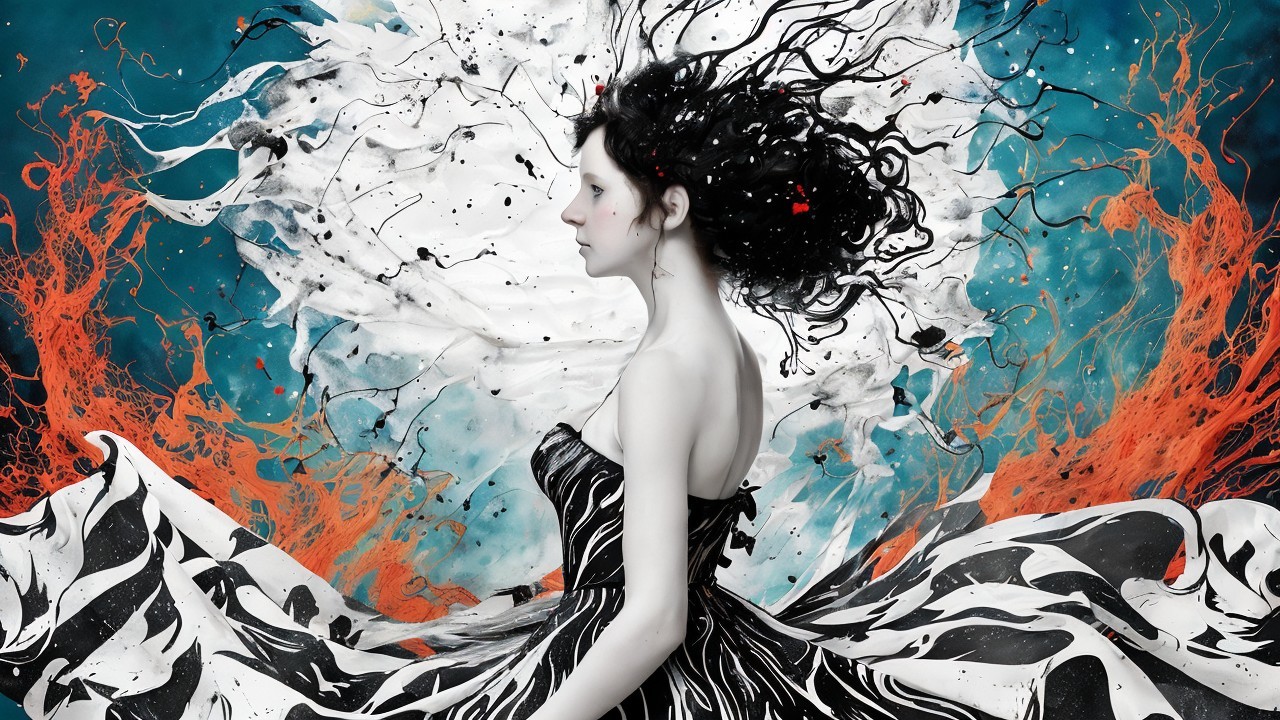 A vibrant splash of primary colors contrasts with black and white, showcasing a young woman in a flowing gown. Her wild curls and delicate features shine against an abstract, dynamic background. prompt is originally by Xymo Nau, I changed the model.