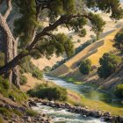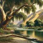 Prompt: A few miles south of Soledad, the Salinas River drops in close to the hillside bank and runs deep and green . . . On one side of the river the golden foothill slopes curve up to the strong and rocky Gabilan mountains, but on the valley side the water is lined with trees—willows fresh and green with every spring . . . and sycamores with mottled, white, recumbent limbs and branches that arch over the pool . . . . There is a path through the willows and among the sycamores, a path beaten hard by boys coming down from the ranches to swim in the deep pool, and beaten hard by tramps who come wearily down from the highway in the evening to jungle-up near water. In front of the low horizontal limb of a giant sycamore there is an ash pile made by many fires; the limb is worn smooth by men who have sat on it.