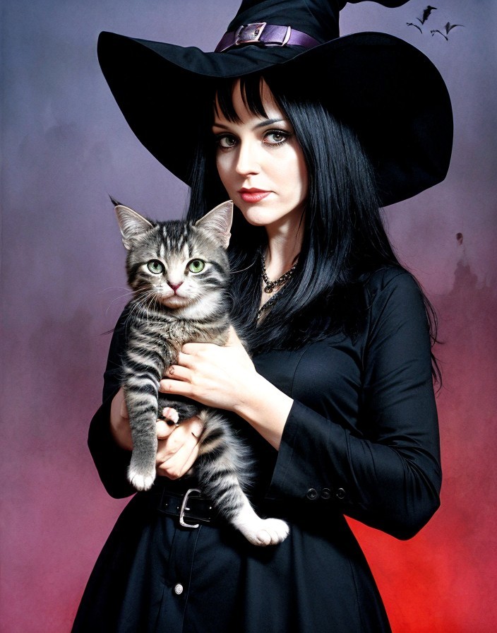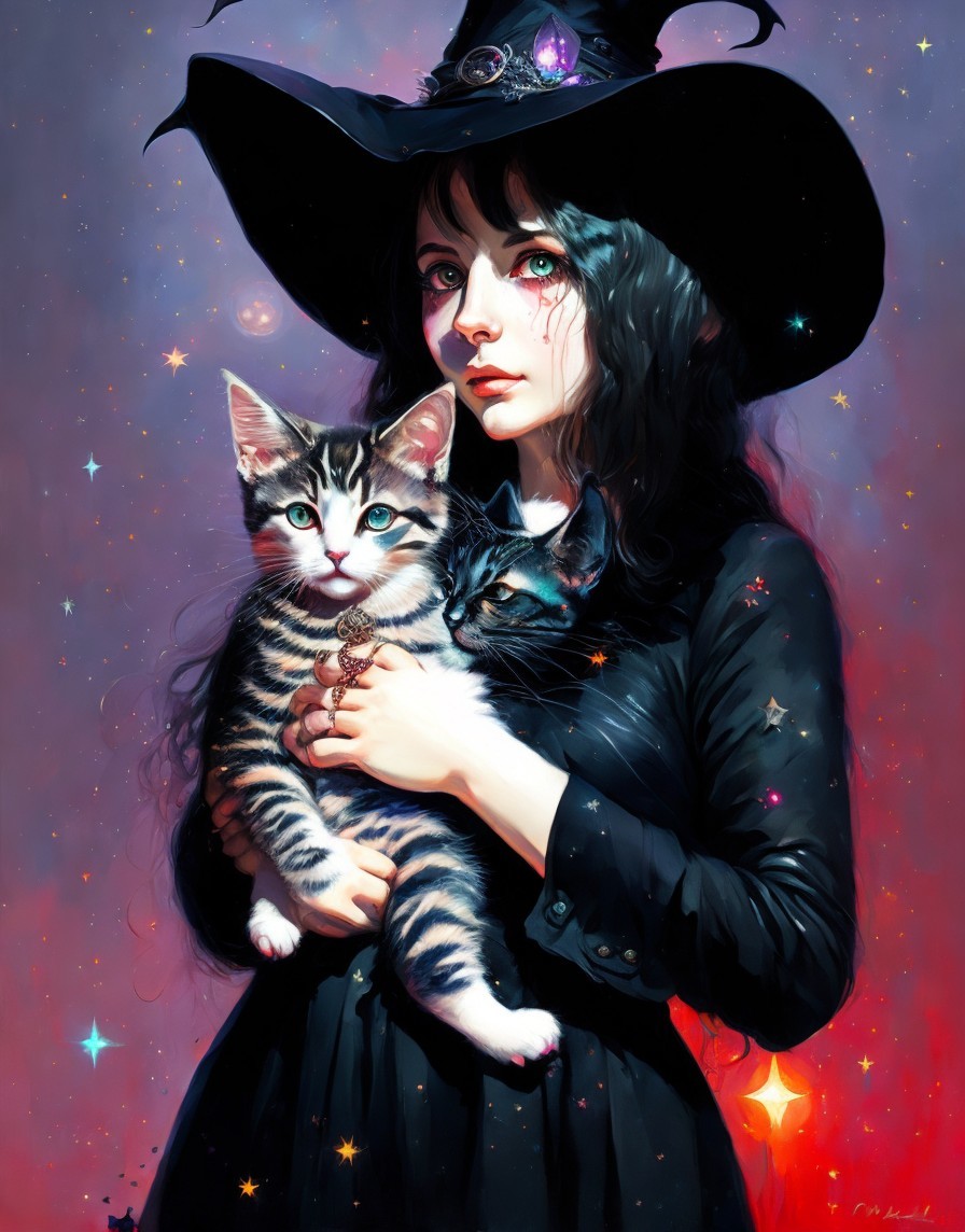 A woman in a black witch's hat holds a gray tabby cat; stars and red lanterns glow softly in the background.
