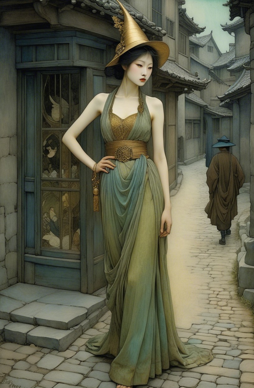 The image depicts a serene woman in a flowing, layered dress, standing in a narrow, ancient street with traditional architecture, exuding grace and elegance amidst a tranquil setting.