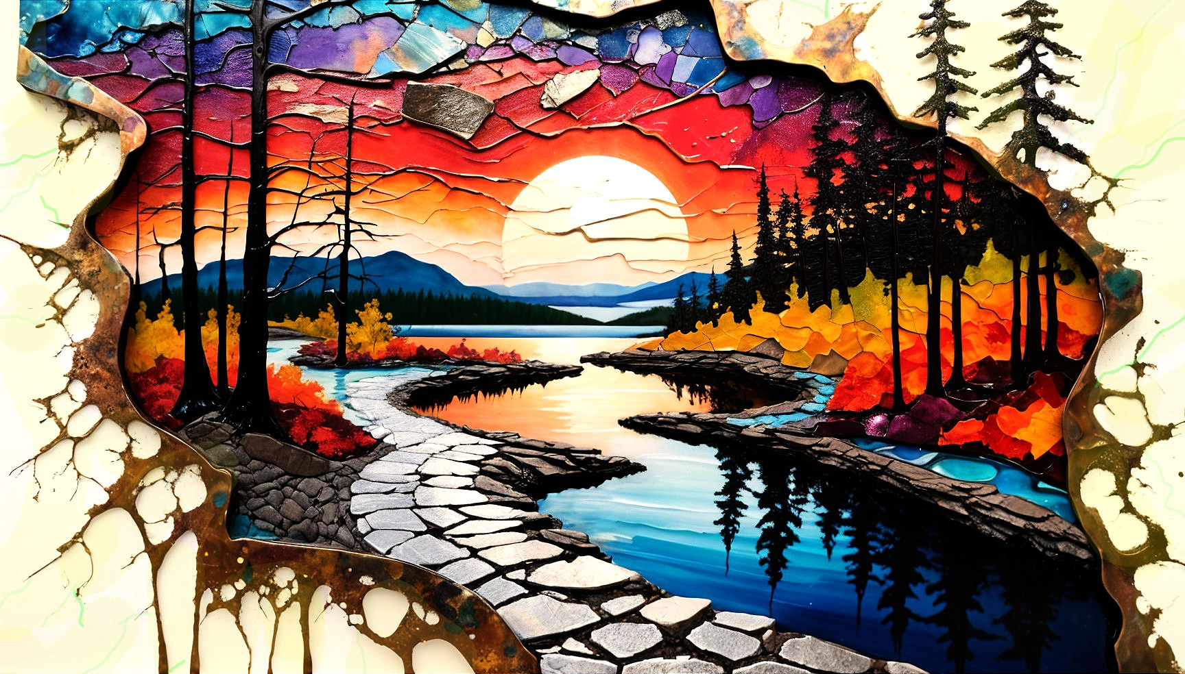 Prompt: Mixed media art with cracked canvas and acrylic pour effects. Close-up of a winding rocky road that disappears into the trees, lake peeking through the trunks. Sunset. Expressive, textured brushstrokes, metallic paint and cracked glass shards embedded in the paint, with visible metal parts. Melted, vibrant colors, warm sunset light shining through the burning mist. Dramatic, emotive, intricate details, blending photorealism with abstract expressionism, reminiscent of Franz Marc and Edvard Munch's energetic use of color. Captured in 4k, hyper-realistic quality, with crisp textures and vivid colors, evoking the emotional intensity of Paul Klee's works. Highly detailed, intricate, beautiful, and high-quality, with a sense of movement
