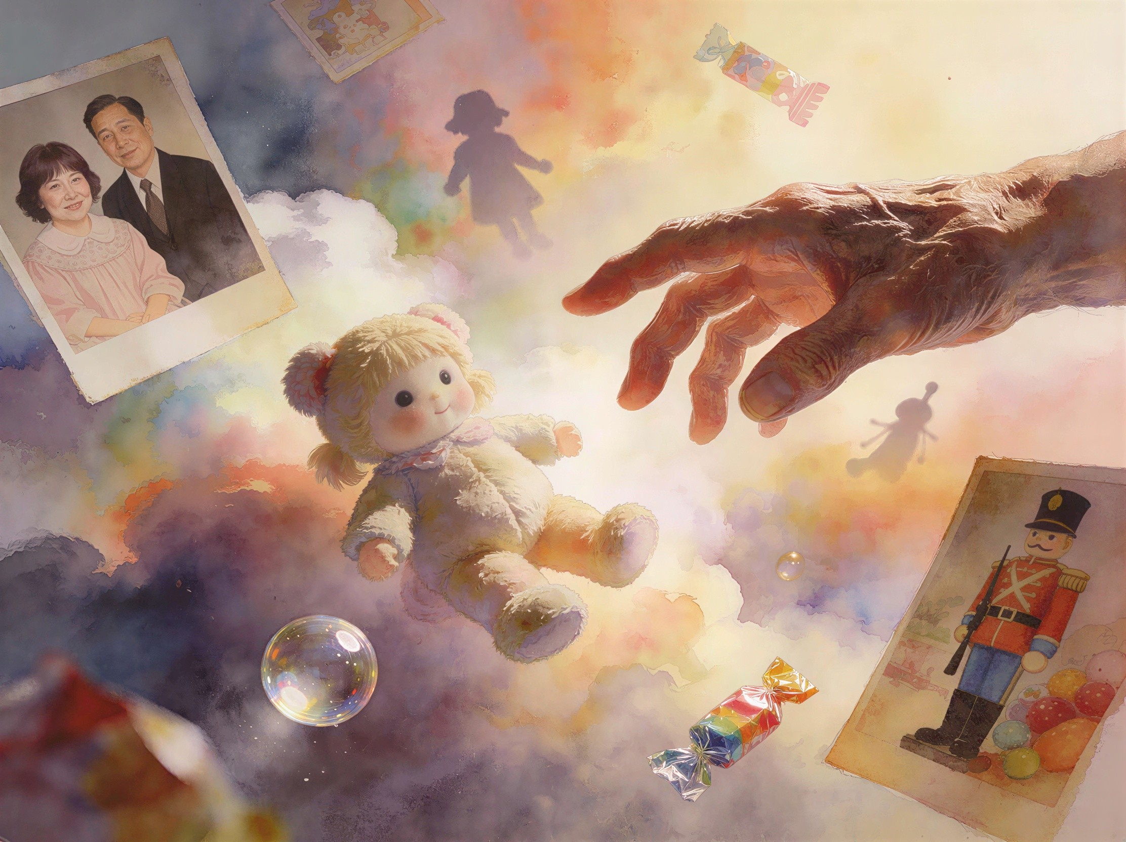 An old hand reaches for a fluffy, cream-colored teddy bear with pink ear cuffs and cheeks, wearing a pink dress. A polaroid photo of an Asian man in a dark suit and tie and a woman in a pink collar shirt smiles, floating on the left. Shadows of a girl and other