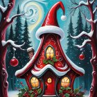 A whimsical illustration of a red winter cottage covered in snow, with a steep red roof, a round turret with a pointed red roof, and a chimney. The cottage has glowing yellow windows, a red door with a green wreath, and is surrounded by small snow-covered evergreen trees. Two large bare