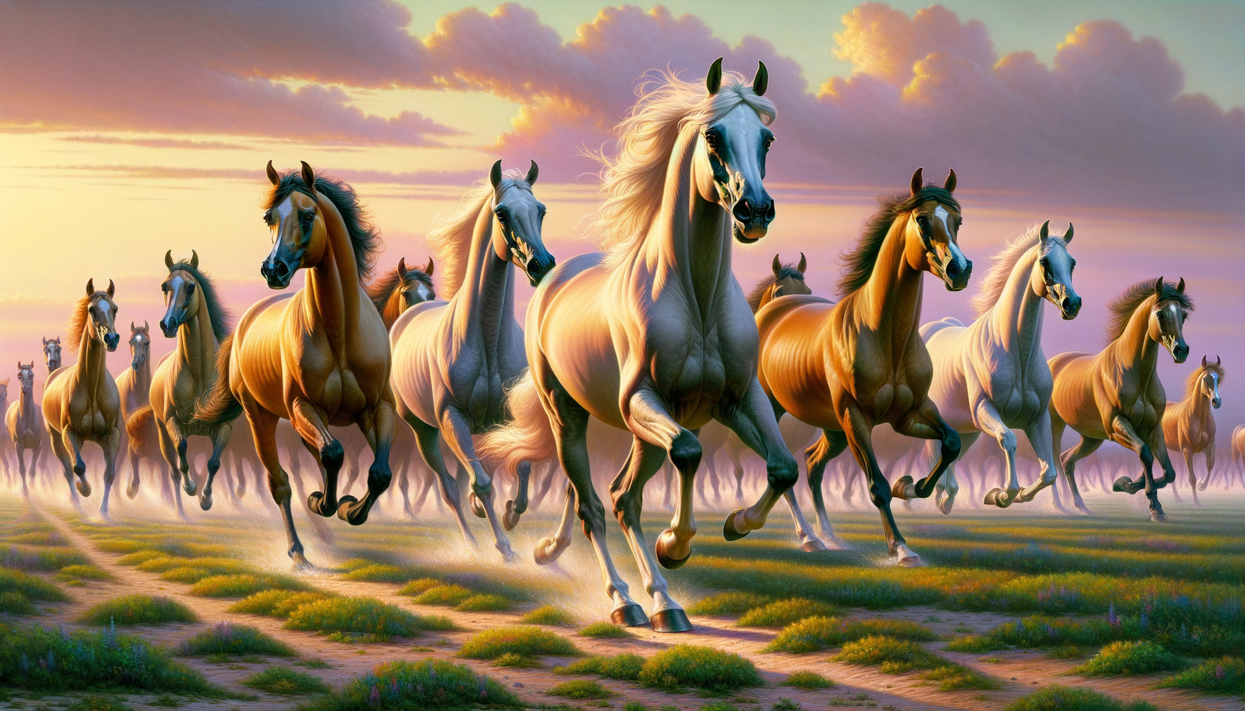 A lively scene of Arabian horses galloping across an open field at dawn. Foreground focuses on a few horses in mid-gallop, with a larger group visible in the background, the colors are Warm hues of dawn, with soft pinks and oranges in the sky and vibrant green on the ground, The early morning light casting long shadows and highlighting the muscles and manes of the horses. Expressive faces of the horses, detailed muscle definition, and dynamic poses to convey movement and energy.