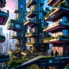 A couple stands on a balcony overlooking a vibrant city skyline at sunset. Modern buildings are adorned with greenery and colorful neon lights, creating a futuristic atmosphere.