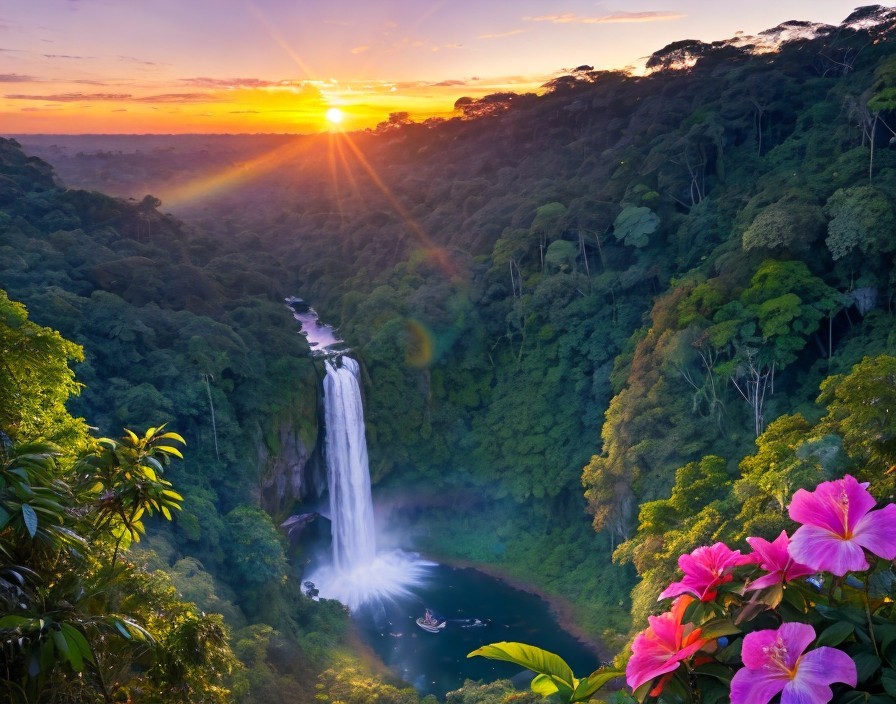 A stunning waterfall cascades through a lush rainforest at sunset, with vivid pink flowers in the foreground and radiant sunbeams piercing the sky.