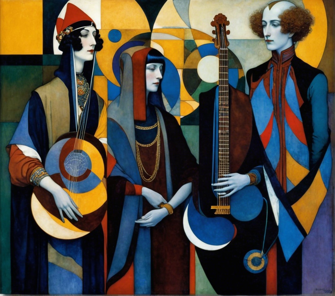 The artwork features a woman in a richly adorned dress with a striking blue and red color scheme, holding a staff. She is surrounded by plant motifs and a luminous, stylized background.