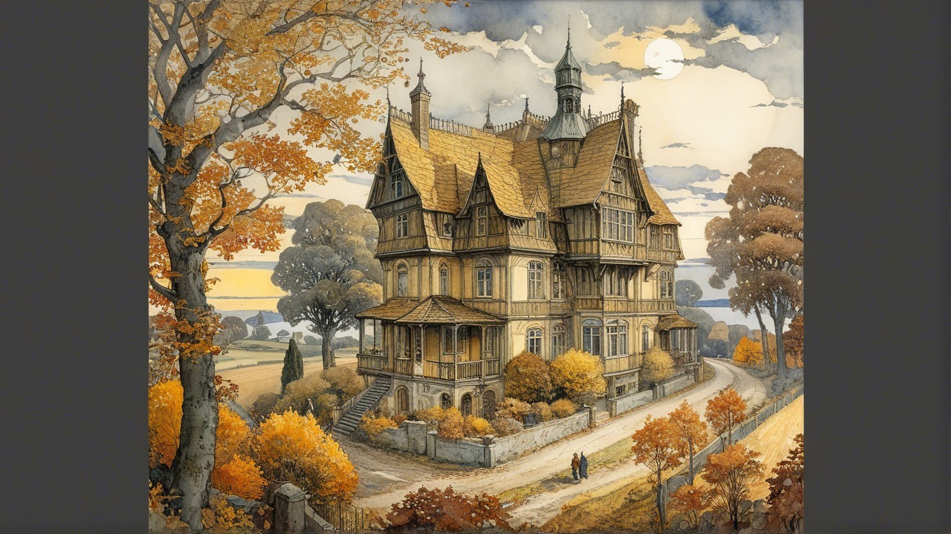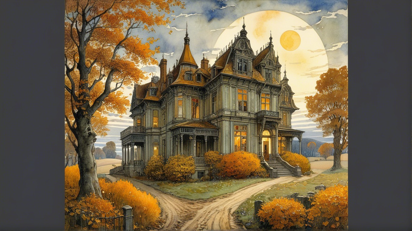A spooky, ornate mansion stands under a full moon, surrounded by vibrant autumn trees and foliage. Its warmly lit windows contrast with the cool night, creating an eerie yet enchanting atmosphere.