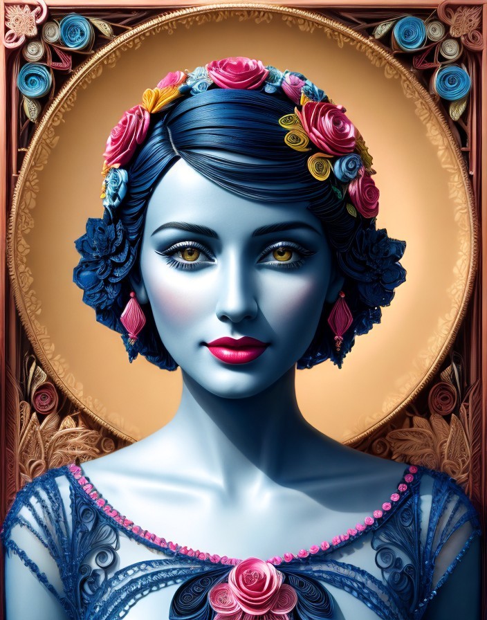 An illustration of a woman with blue skin, flower-adorned hair, and striking yellow eyes in a decorative frame.