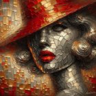 The image features a mosaic artwork of a glamorous woman with silver and gold accents, striking red lips, and a stylish hat. Vibrant red and gold tiles create a captivating backdrop.
