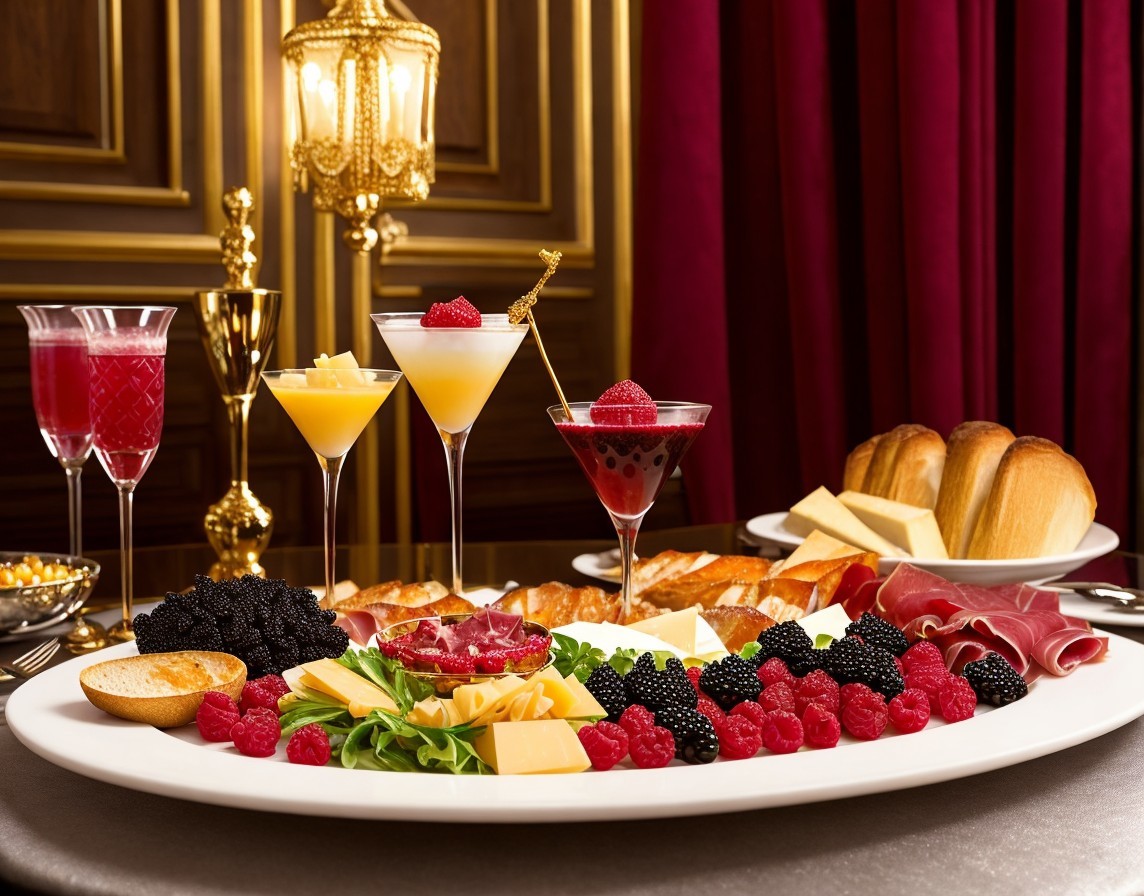 Opulent dining setting with cocktails, caviar, cheese, bread, and prosciutto on a red tablecloth, gold accents, and a velvet backdrop.