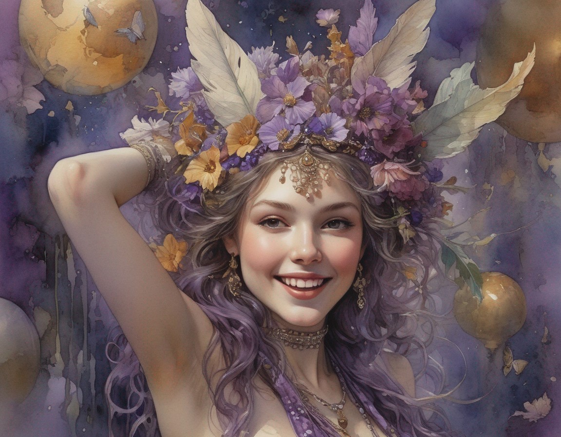 Purple haze. Beautiful sensual woman feeling so happy, all joy, fun and happines, having a wonderful time, surrounded by all good and lovely things, love, joy and peace, by Jean-Baptiste Monge, watercolor ink, intricate details, fantasy, beautiful, award winning, fantastic view, crisp quality, Peter Gric, Ivan Shishkin, light reflections, vibrant colours, volumetric lighting, polished, masterful surrealism, high definition, crisp quality