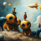 A surreal scene featuring whimsical creatures with large round heads, playful figures, and colorful balloons against a dreamlike sky. The atmosphere is imaginative and fantastical.