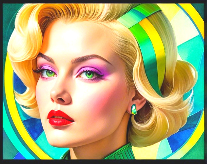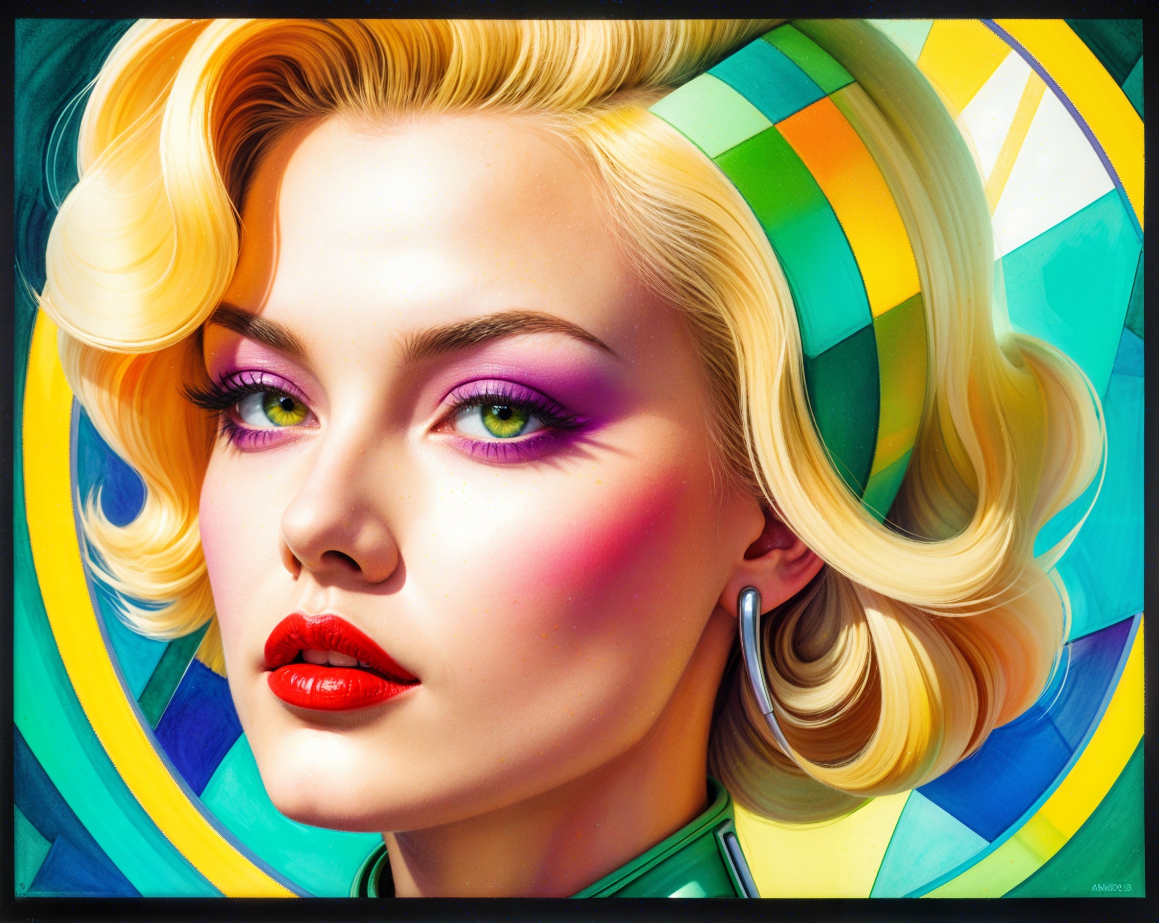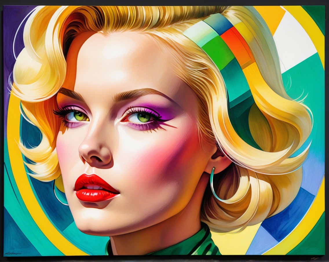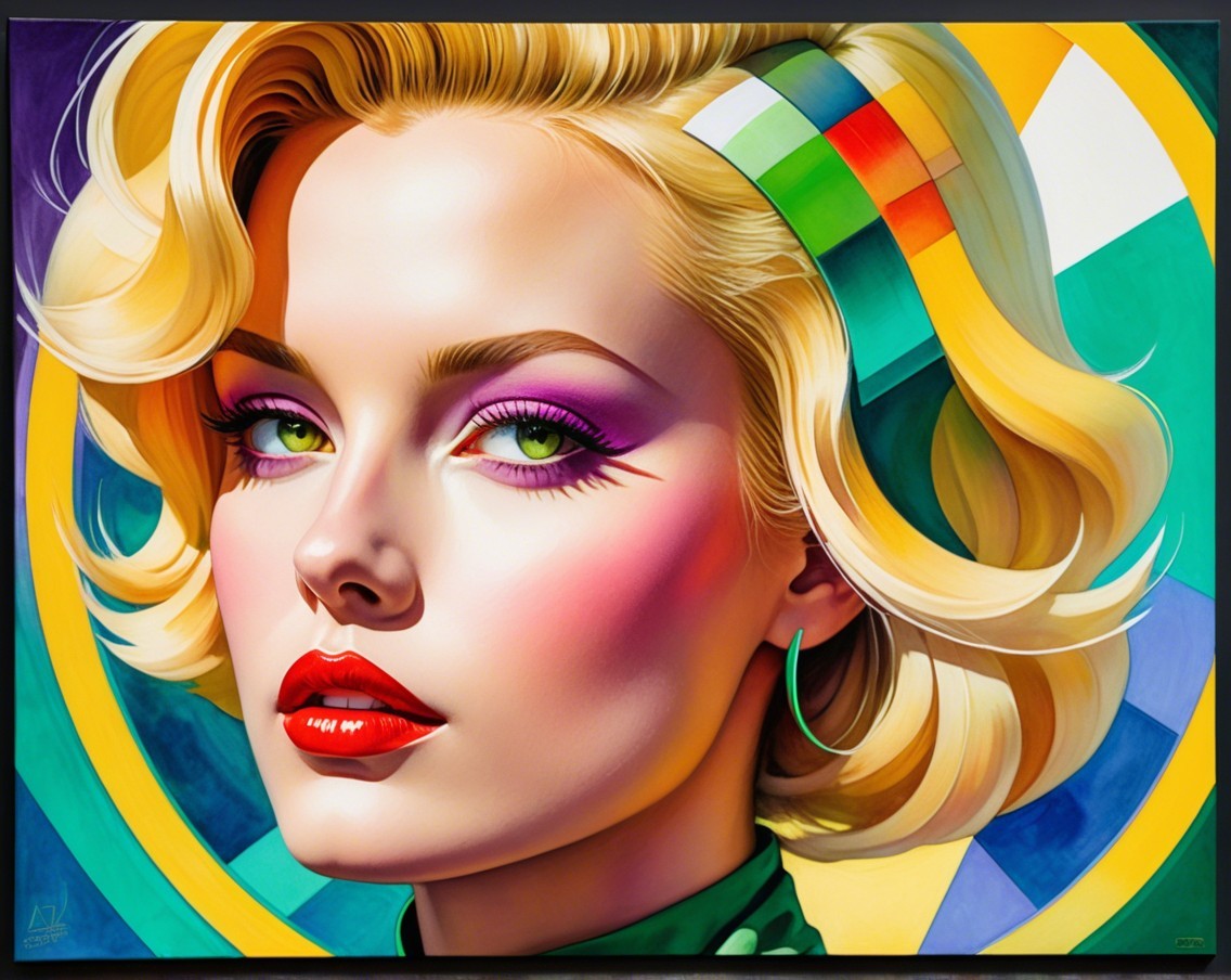 brushed oil on canvas, red, green, yellow, lilac and white with an retrofuturistic, detailed and fabric textured background, minimalistic, female beautiful blonde lady, zen lines, abstract science fiction art by William Bradley and frank Fazetta, watercolor, pen, alcohol ink, colored, intricate detailed, sci-fi, futuristic, cyberpunk,uhd hdr, octane render, traumacore 1.2, streamline_moderne merged with space age style, dynamic lighting 1.7, line-art, dynamic lighting 1.2, visible brushstrokes, thickened gouache ,dystopian, serene face expression, space age style by Curtis Cole and William Bradley, enlightened hues, plasticity 1.6, wispy textured background with stylized green brushstroke fields, libel filament patterns,, sci-fi setting, background in triadic color scheme auburn green yellow, tessellated pattern background, green to yellow color palette, red to yellow hues, brightness1.9, warm tones, hues in edges of hairstyle, collar, american gothic 1.7, octane render illustration, vibrant green, hues by Georgia o'keffee, 3d effects 1.8, ambient occlusion 1.5, raytraced shadows, shadow mapping 1.3 anisotropic filtering 1.7, brightened daguerreotype photography on old paper, glossy, calm atmosphere, overall composition by Georgia o'keffee and Overton Lloyd, uhd, hdr, octane render illustration