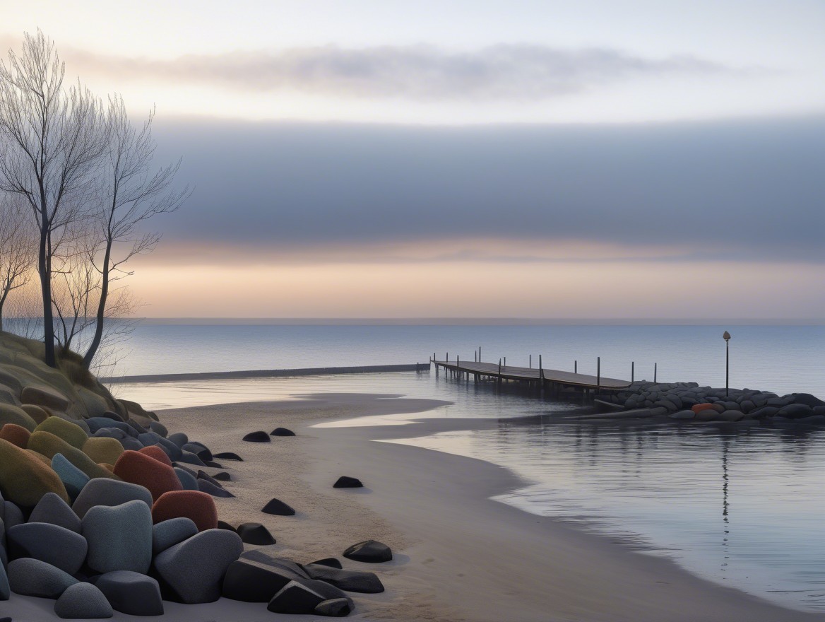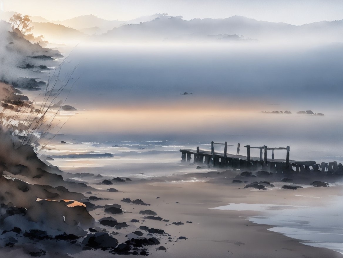 A figure in light clothing stands on a sandy beach, gazing at the waves under a cloudy sky. Rocky formations line the shore, creating a serene atmosphere as the sun sets.