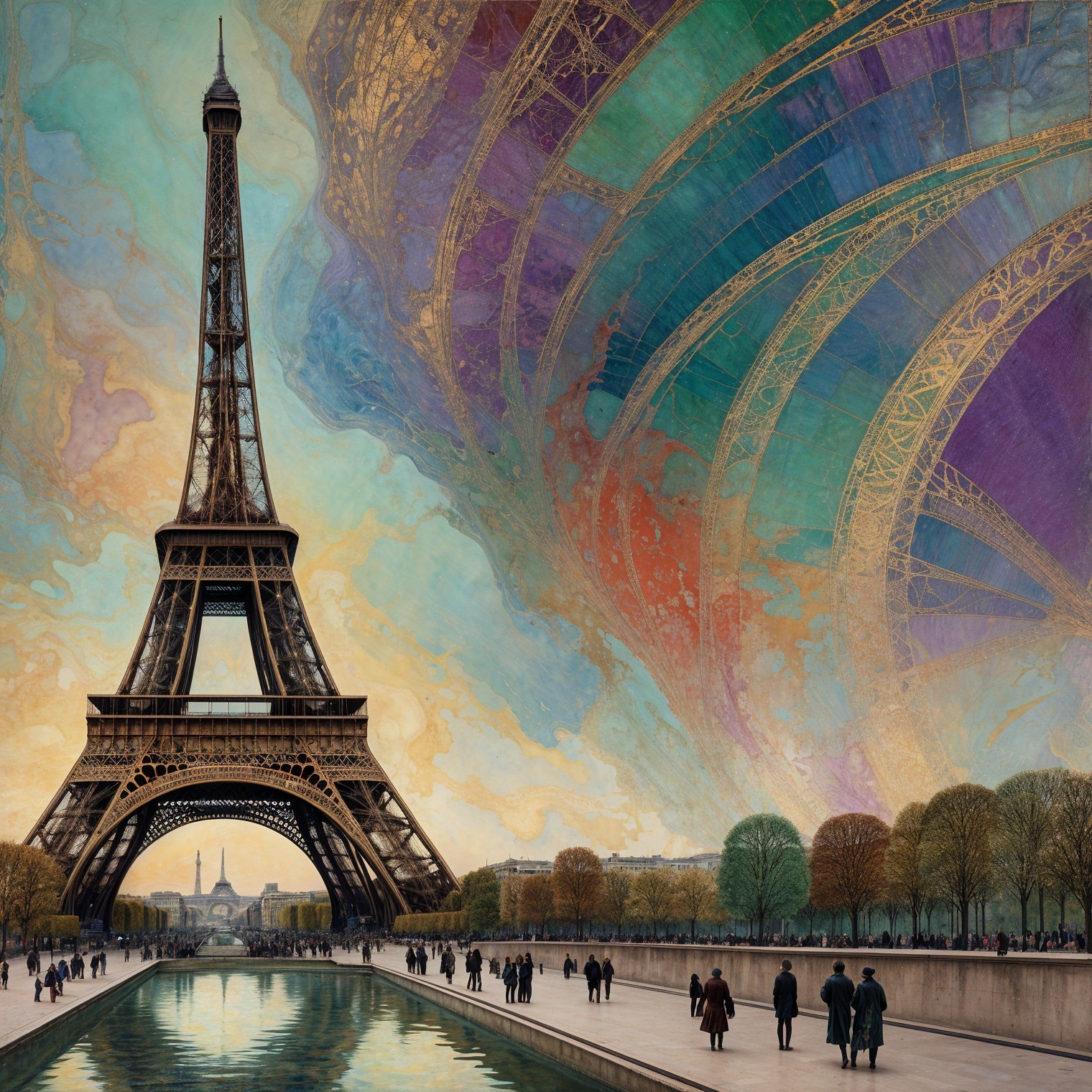 The Eiffel Tower stands majestically beside a serene river, framed by artistic swirls of vibrant colors and dreamy clouds, blending nature and imagination in a stunning landscape.