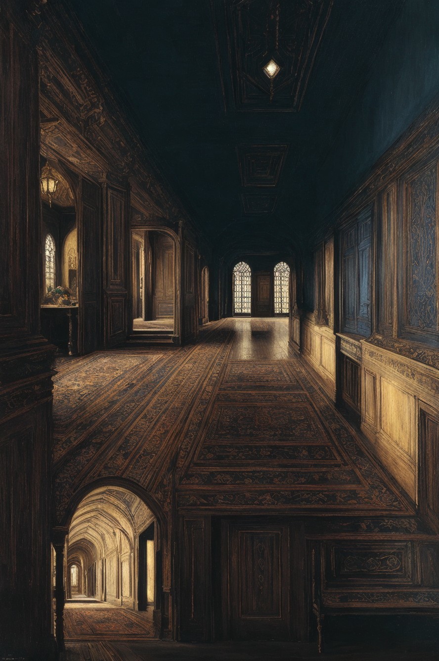 + Prompt:A doorway leading to another doorway, an endless corridor with faultless perspective, elegant old oil painting, beautiful muted blues with natural oak style wooden features