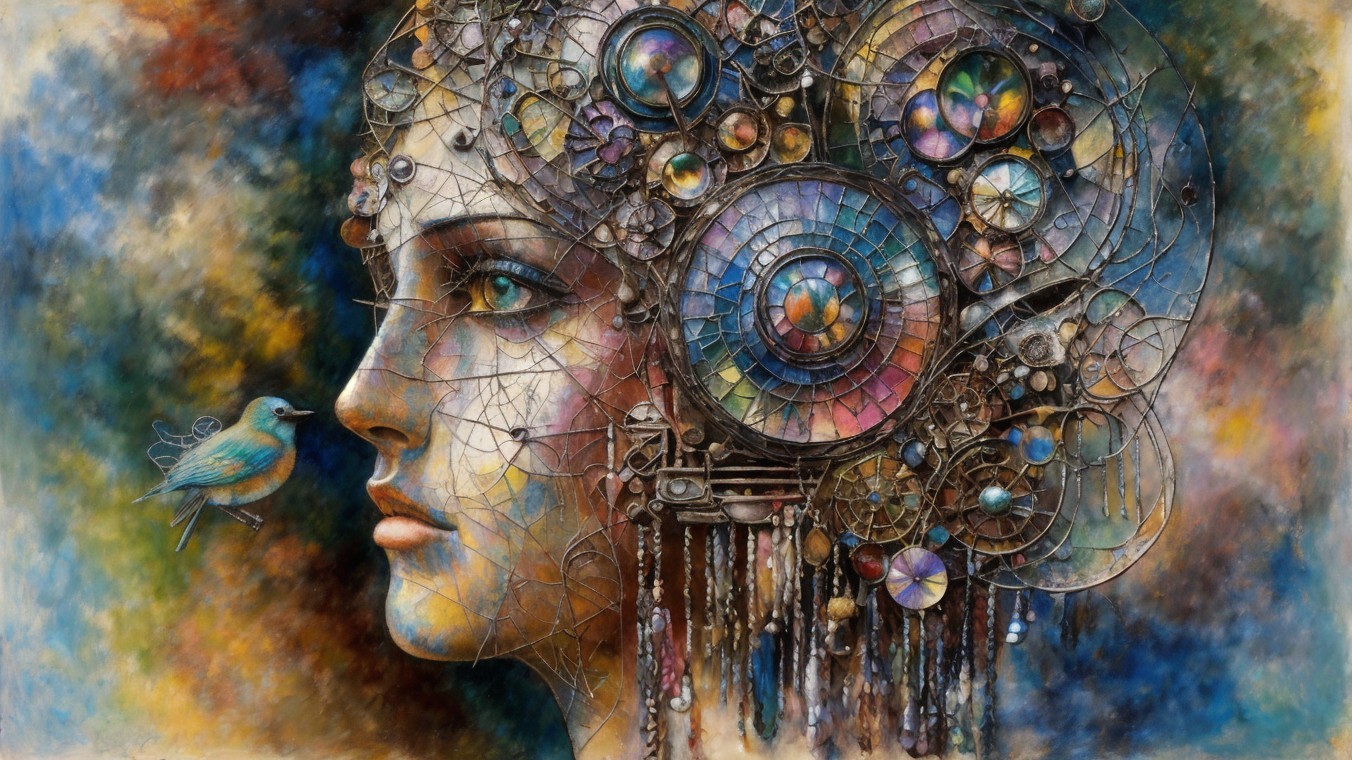 A serene portrait of a woman with cosmic elements in her hair, including planets and swirls, gazes softly at a small, colorful bird, creating a whimsical, dreamlike atmosphere.