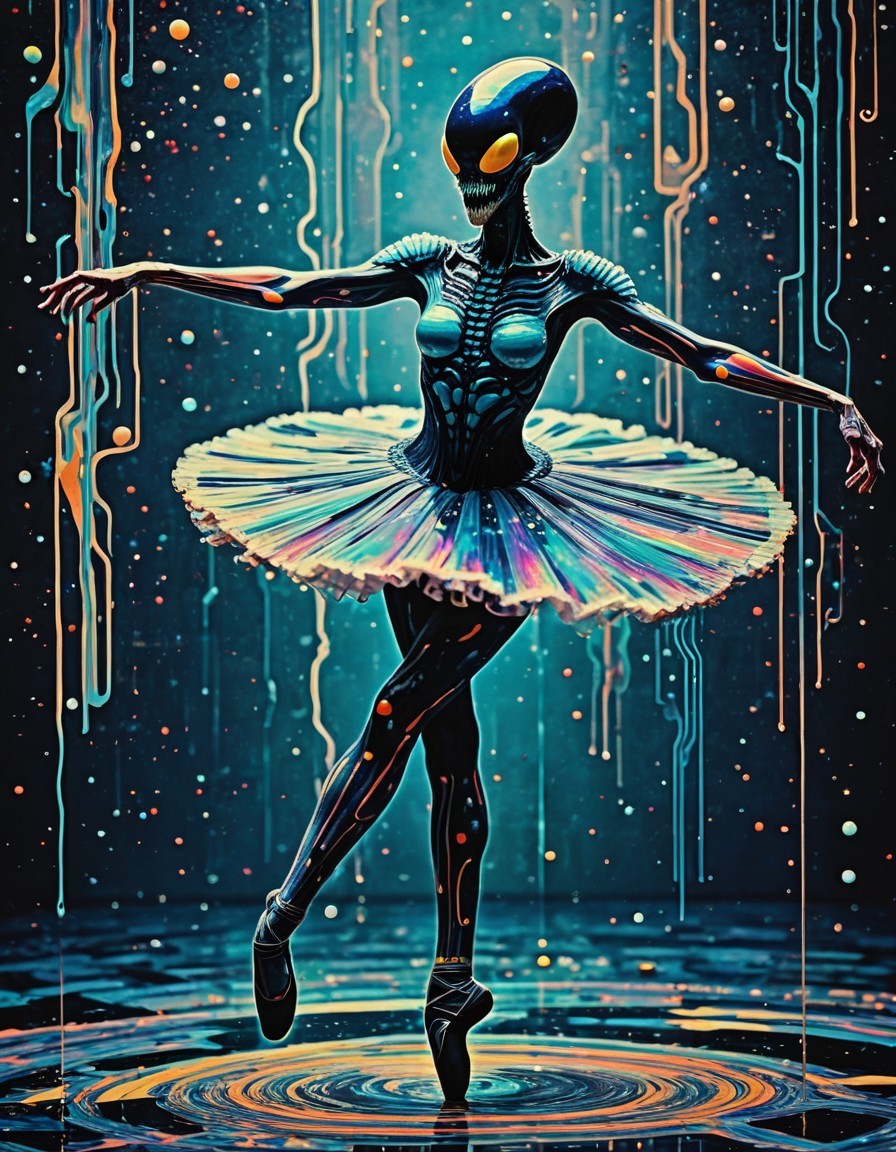 The colors have a glitching glowing quality and each color looks like they're on their own layer of glass in polaroid {Heavy Gustav Klimt make xenomorph as ballerina Klimt's_Glitch style} Nyarlepthotep as Transfer & Emulsion Lifts of Secret 814-884 anti-gravity Earthworm Jim steps on a atomic implosion depicted as vertical translucent final image distorting optical glitch anomalies of databending of cracked analog errors and contemporary art masterpiece, spanish vibe, modern art, experimenting, twisted deep vision of unknown and known, generic coneptuality, abstract, feeling with no form.