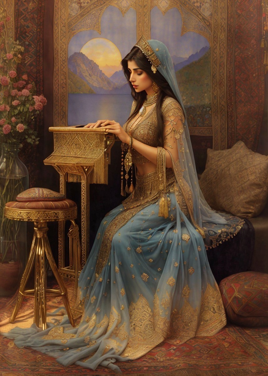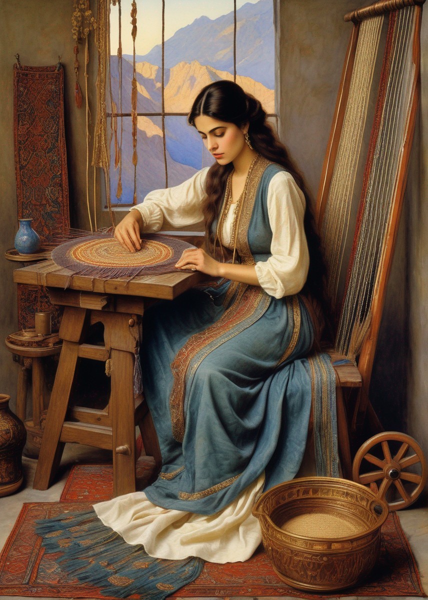 A woman in a blue dress sits at a loom, focused on weaving, with earthen pots and a rugged landscape in the background.