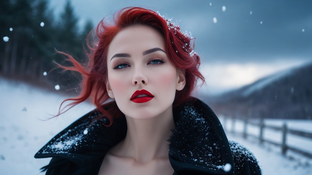 A striking portrait of a woman with vibrant red hair and bold red lips, set against a snowy landscape. She exudes elegance, with snow gently falling around her in a dramatic, wintry atmosphere.