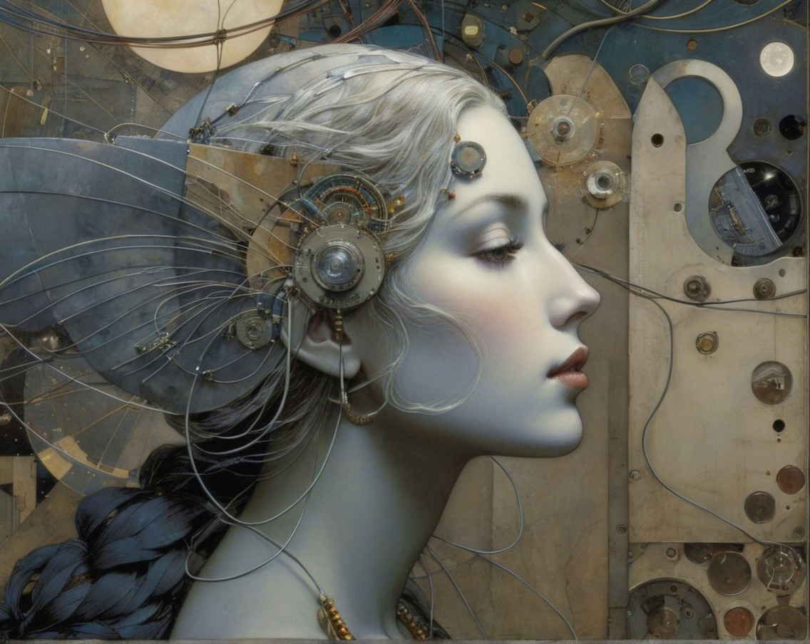 A surreal portrait of a woman with intricate mechanical elements integrated into her hair, blending organic and artificial forms, set against a cosmic backdrop with celestial bodies.