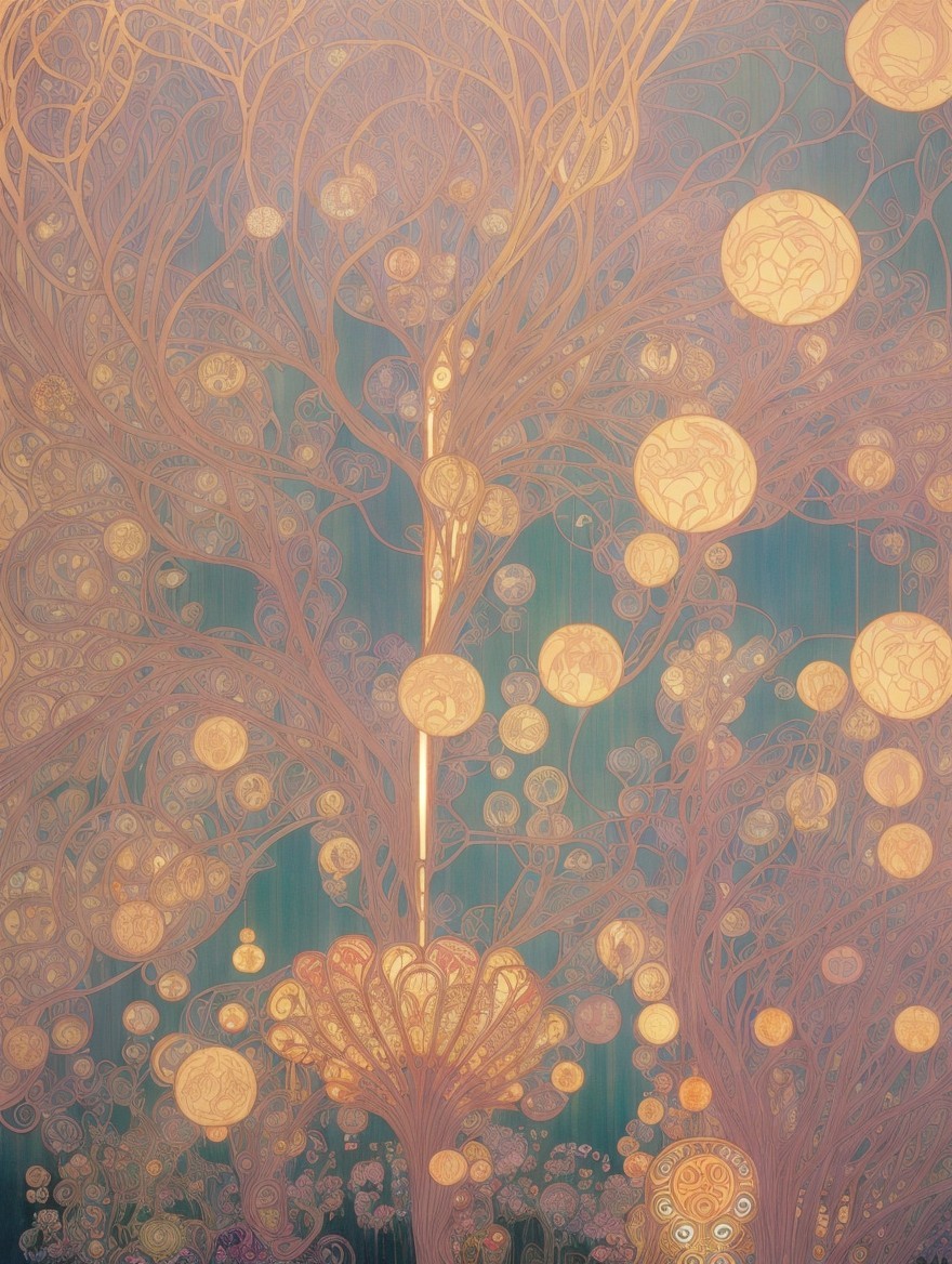 Ethereal Illustration of a Glowing Tree and Lanterns
